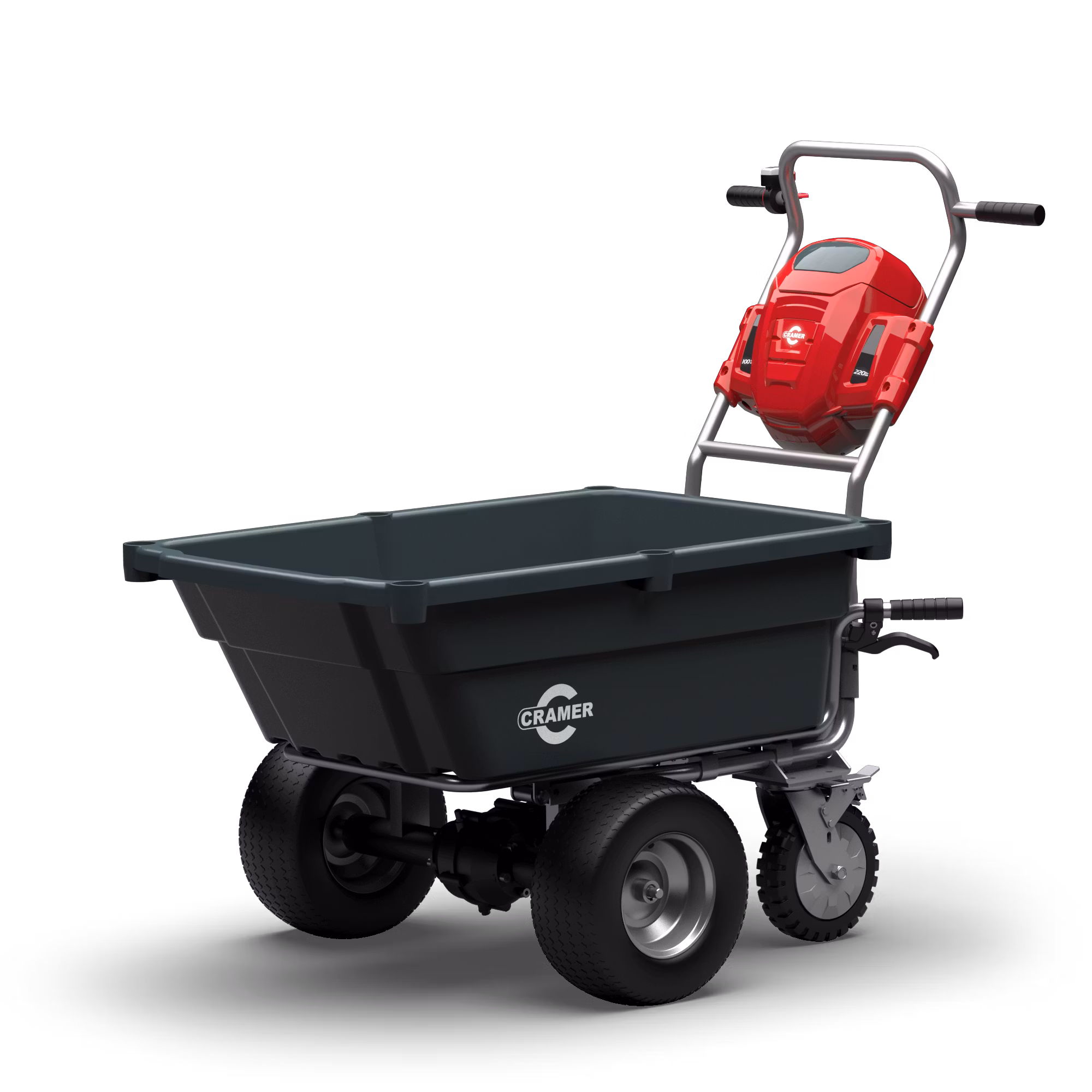 82UC är en kraftfull batteridriven trädgårdskärra för professionell användning, som erbjuder självgående transporter för att göra de mest krävande jobben enkla. Den kraftiga lastflaken har en kapacitet på 150 kg / 106 l med gasfjäderstödd tiltfunktion för att enkelt tömma tunga laster. Som med alla produkter i Cramer 82V-serien är batteriet utbytbart för bekvämlighet och flexibilitet.