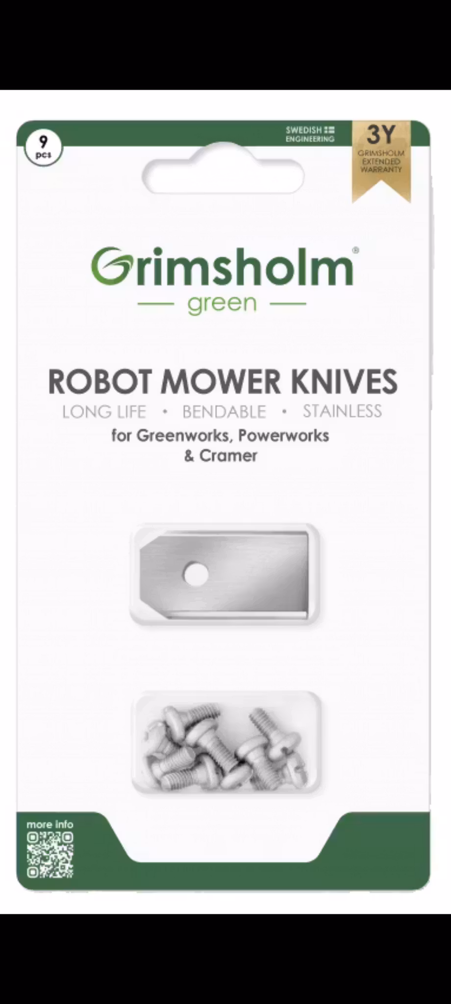 Knivarna är tillverkade av rostfritt stål och har optimerats för bästa möjliga balans mellan styrka, skärpa och slitstyrka för toppklippresultat. Bladen är böjbara. Detta innebär att du inte behöver oroa dig för knivrester i gräsmattan om kniven träffar en sten eller annat hårt material.